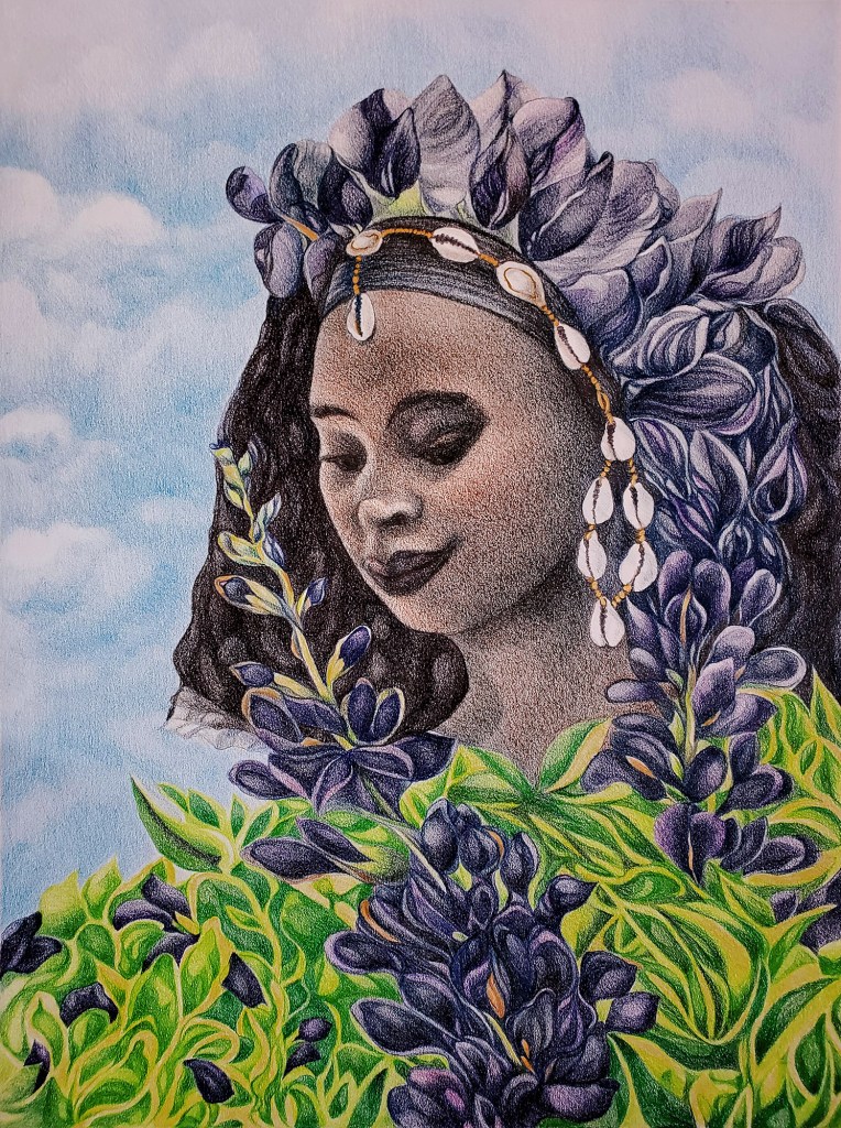 Indigo dyeing was responsible for the enrichment and empowerment of W. African women. The source of this knowledge was passed through many centuries from Iya Mapo. In the first drawing below, she is seated in front of an Adire cloth design, holding a branch of the Elu bush whose leaves are crushed to make the indigo dye. In a spiritual ritual the agbe, or sacred bird, dips its tail in the indigo pot and anoints the divine pigment. In other drawings in this series, deities of the air and water contribute to the success of this difficult and capricious process.