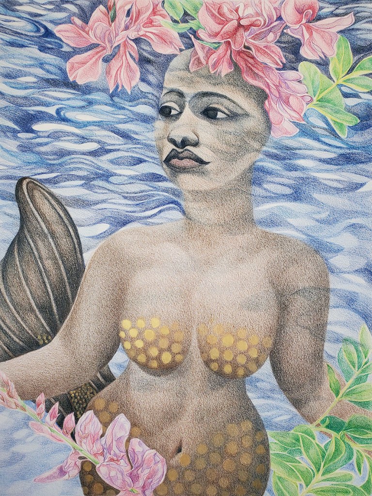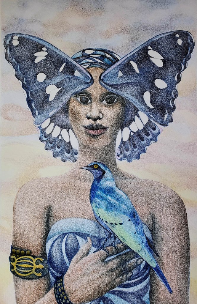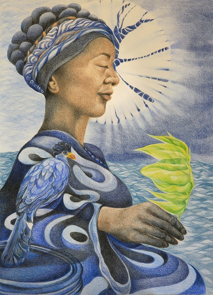 The process of indigo dyeing in Yorubaland was developed by Iya Mapo and passed through many centuries of West African women promoting enrichment, status, and empowerment in their communities. In the drawing below, Iya Mapo holds the branch of an Elu bush whose leaves are crushed to make the indigo dye. As part of the spiritual ritual, a sacred bird dips its tail into the indigo pot and is anointed with the divine pigment. Deities of water and air contribute to the successful cultivation.